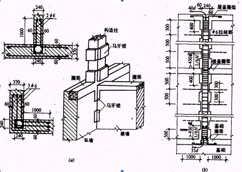 b. 构造柱与墙连结处宜砌成马牙槎,并应沿墙高每500mm设2φ6拉接筋,每边伸人墙内不少于1m(如构造柱马牙槎构造图)。