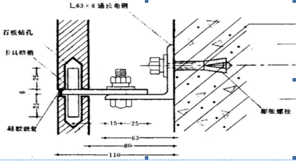 干挂石材的施工方法是用一组高强耐腐蚀的金属连接件,将饰面石材与结构可靠地连接,其间形成空气间层不作灌浆处理(构造见下图)。