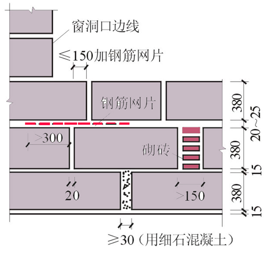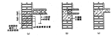(1)隔墙普通粘土砖隔墙 用砖顺砌为半砖墙;侧砌1/4砖墙,并采用M2.5级或M5级砂浆砌筑。当半砖墙高度超过3m,长度超过5m时,就应该考虑墙身的稳定而采取加固措施,其做法是每隔8~10皮砖砌入φ6钢筋一根。隔墙上部与楼板相连处,用立砖斜砌,以防止上部结构构件产生挠度使隔墙被压坏。隔墙上设门时,需采用预埋铁件,或用带木楔的混凝土预制块,使门框固定在砖墙上。
