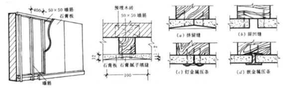 板材类装修系指采用天然木板或各种人造薄板借助于镶钉胶等固定方式对墙面进行装饰处理。板材类墙面由骨架和面板组成,骨架有木骨架和金属骨架,面板有硬木板、胶合板、纤维板、石膏板等各种装饰面板和近年来应用日益广泛的金属面板。常见的构造方法如下: