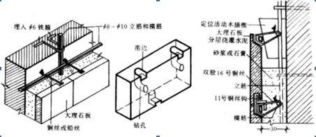 天然石材和人造石材的安装方法相同,先在墙内或柱内预埋φ6铁箍,间距依石材规格而定,而铁箍内立φ6~φ10竖筋,在竖筋上绑扎横筋,形成钢筋网。在石板上下边钻小孔,用双股16号钢丝绑扎固定在钢筋网上。上下两块石板用不锈钢卡销固定。板与墙面之间预留20 ~ 30mm缝隙,上部用定位活动木楔做临时固定,校正无误后,在板与墙之间浇筑1:3水泥砂浆,待砂浆初凝后,取掉定位活动木楔,继续上层石板的安装(构造见下图)。