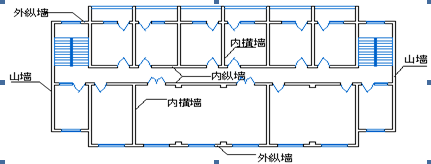 纵横墙承重:由纵向墙和横向墙共同承受楼板、屋顶荷载的结构布置称纵横墙(混合)承重方案。特点:房间布置较灵活,建筑物的刚度亦较好。混合承重方案多用于开间、进深尺寸较大且房间类型较多的建筑和平面复杂的建筑中,前者如教学楼、住宅等建筑(如图)。