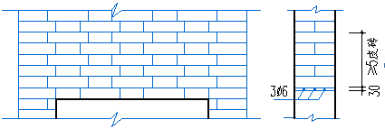钢筋砖过梁用砖不低于MU7. 5,砌筑砂浆不低于M2. 5。一般在洞口上方先支木模,砖平砌,下设3~4根φ6钢筋要求伸人两端墙内不少于240mm,梁高砌5~7皮砖或≥L/4,钢筋砖过梁净跨宜为 1. 5~2m(如图)。