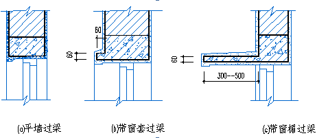 钢筋混凝土过梁有现浇和预制两种,梁高为60mm、120mm、180mm、240mm,即60mm的整倍数。梁宽一般同墙厚,梁两端支承在墙上的长度不少于240mm,以保证足够的承压面积。