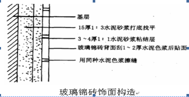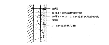 面砖应先放入水中浸泡,安装前取出晾千或擦干净,安装时先抹15mm 1:3水泥砂浆找底并划毛,再用1:0.3:3水泥石灰混合砂浆或用掺有107胶(水泥用量5%~7%)的1:2.5水泥砂浆满刮l0mm厚于面砖背面紧粘于墙上。对贴于外墙的面砖常在面砖之间留出一定缝隙(如图)。