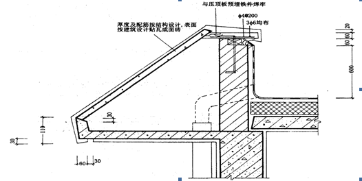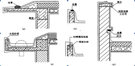 根据挑檐挑出的长度,有直接利用混凝土防水层悬挑和在增设的现浇或预制钢筋混凝土挑檐板上做防水层等做法。无论采用哪种做法,都应注意做好滴水。