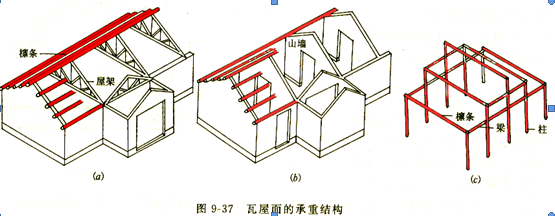 ②屋架承重是指由一组杆件在同一平面内互相结合成整体屋架,在其上搁置檩条来承受屋面重量的一种结构方式。