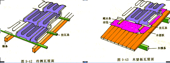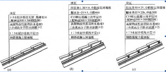 (1)冷摊瓦屋面 基层只设木椽条和木挂瓦条两种构件。构造简单,自重轻,但雨水易从瓦缝中浸入室内,通常仅用于防水等级不高的建筑。
