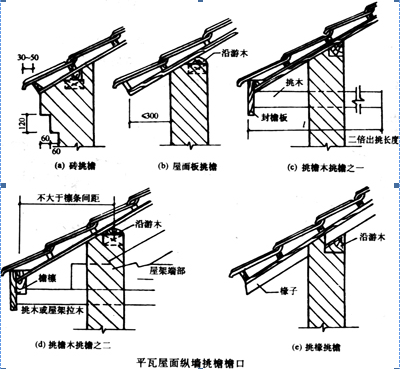 瓦屋面一般伸出外墙一段距离,以保护外墙免遭雨淋,挑出部分称为挑檐,也叫檐口。挑檐按所处位置不同分为纵墙挑檐和山墙挑檐。