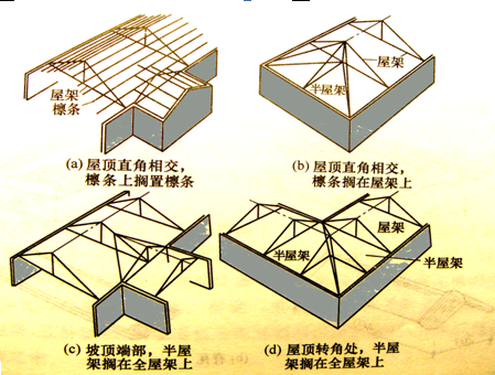 屋面垂直相交处的结构布置有两种做法:一种是把插入屋面的檩条搁在与其垂直的屋面檩条上,另一种是用斜梁或半屋架一端支承在转角的墙上,另一端支承在屋架上;