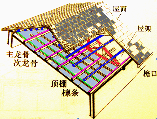 悬山屋顶是将屋面檩条向外悬挑一部分,故称悬山。挑檐上面覆瓦,下面做吊顶,端部做封檐板,也叫博封板。