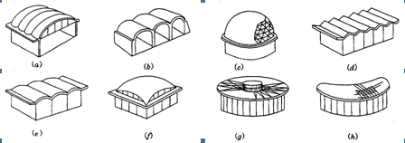 (e)筒壳屋面;(f)扁壳屋面;(g)车轮形悬索屋面;(h)鞍形悬索屋面