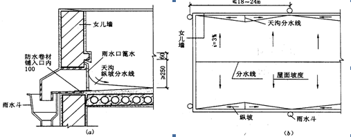 平屋面女儿墙外排水三角形天沟(a)女儿墙断面图;(b)屋面平面图
