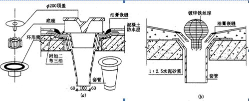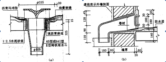 直管式雨水口为防止雨水从雨水口套管与沟底接缝处渗漏,应在雨水口周边加铺柔性防水层并铺至套管内壁,檐口处浇筑的混凝土防水层应覆盖于附加的柔性防水层之上,并于防水层与雨水口之间用油膏嵌实。[直管式雨水口构造见下图]