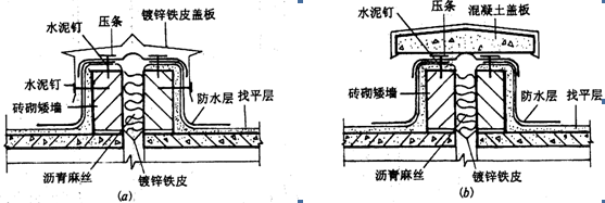 刚性防水屋面的泛水构造要点与卷材屋面基本相同。不同的地方是:刚性防水层与屋面突出物(女儿墙、烟囱等)间须留分格缝,另铺贴附加卷材盖缝形成泛水。