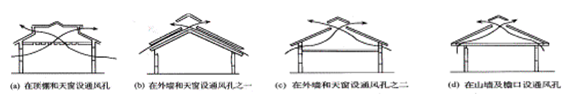 炎热地区在坡屋面中设进气口和排气口,利用屋面内外的热压差和迎风面的压力差,组织空气对流,形成屋面内的自然通风,以减少由屋面传入室内的辐射热,从而达到隔热降温的目的。进气口一般设在檐墙上、屋檐部位或室内顶棚上;出气口最好设在屋脊处,以增大高差,有利加速空气的流通。