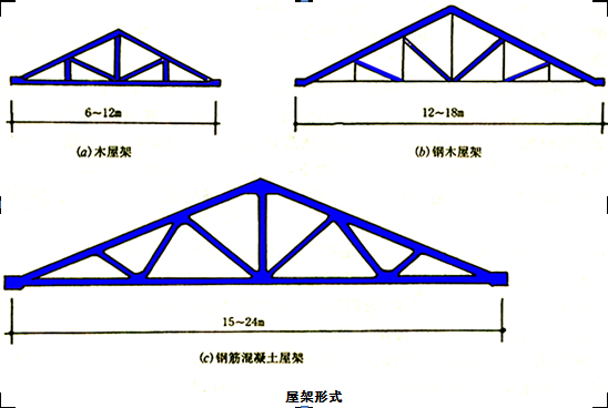 屋架形式常为三角形,由上弦、下弦及腹杆组成,所用材料有木材、钢材及钢筋混凝土等。