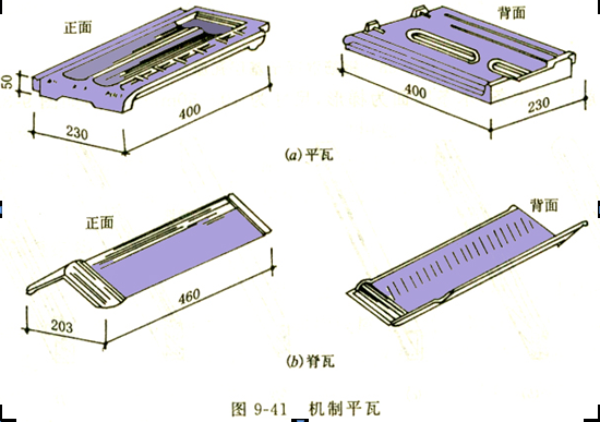 机制平瓦是由粘土焙烧而成,有普通平瓦和脊瓦之分。平瓦的规格为230mm和400mm,四边带有榫和沟槽,利用其相互搭扣密合,以防雨水从接缝渗入。脊瓦有阳角脊瓦和阴角脊瓦两种,专门用以处理屋脊和沟槽部位瓦的收头铺盖。为了减少雨水自瓦缝渗入,平瓦屋面坡度一般不宜小于1∶2(约26°),多雨地区则需更大些。