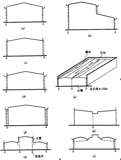 高低跨双坡屋面在两跨交界处也常常需要设置内天沟来汇集低跨屋面的雨水,高低跨可共用一根雨水管。