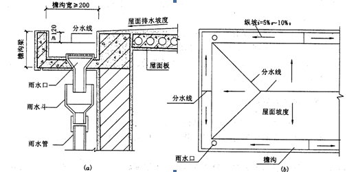 天沟即屋面上的排水沟,位于檐口部位时又称檐沟。设置天沟的目的是汇集屋面雨水,并将屋面雨水有组织地迅速排除。天沟根据屋面类型的不同有多种做法。如坡屋面中可用钢筋混凝土、镀锌铁皮、石棉水泥等材料做成槽形或三角形天沟。平屋面的天沟一般用钢筋混凝土制作,当采用女儿墙外排水方案时,可利用倾斜的屋面与垂直的墙面构成三角形天沟;当采用檐沟外排水方案时,通常用专用的槽形板做成矩形天沟。