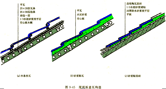 (2)木望板瓦屋面 在平瓦的下部增设有木望板、防水卷材和固定卷材的顺水条,防水避风及保温效果比冷摊瓦屋面要改善许多,木望板瓦屋面多用于防水质量要求较高的建筑中。