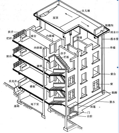 图1为民用建筑的剖面轴测图,从图中我们可以看到房屋的主要组成部分,它们是: