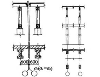 横向变形缝处柱与定位轴线的联系(图21b):横向温度伸缩缝和防震缝处的柱子采用双柱双屋架,可以使结构与建筑构造简化。根据伸缩缝与防震缝宽度的要求,此处应设两条横向定位轴线,两柱的中心线应从定位轴线向缝的两侧各移600mm。两条定位轴线间设插入距ai值,即伸缩缝或防震缝的缝宽ae。该处两横向定位轴线与相邻横向定位轴线之间的距离与其他轴线间的柱距相等。