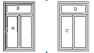 六、下图中A为外开平开窗、B为上悬窗、C推拉窗、D中悬窗,试画出窗开启线表示方式。(6分)
