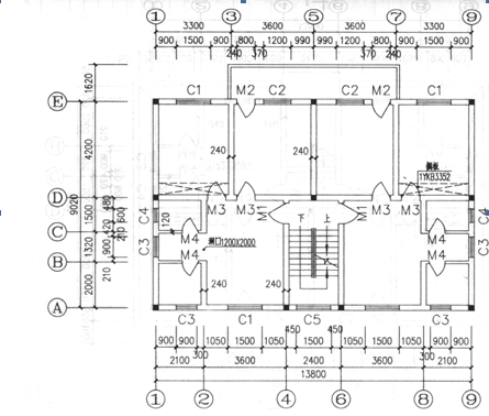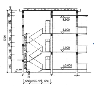 1. 某三层公共建筑开间3300mm,进深5100mm,层高3300mm,开敞式楼梯,见设计题图1。内墙240mm,轴线居中,外墙360mm,轴线外侧为240mm,内侧为120mm,室内外高差450mm。楼梯间不通行。试绘出楼梯间一、二层、三层平面图及剖面图,列出计算过程,标注必要标高和尺寸。